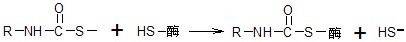 微生物在呼吸時消耗糖類物質(zhì)、釋放能量維持細(xì)胞內(nèi)各種成分的合成和利用、能量貯存及轉(zhuǎn)化都涉及酶類物質(zhì)。酶是一種大分子蛋白質(zhì),帶有巰基、氨基或微量金屬離子。如果抗菌劑進入菌體后能和酶類物質(zhì)結(jié)合,并在一定程度上影響酶的活性,能量代謝體系的運轉(zhuǎn)就會受到影響,呼吸作用也就被抑制或停止。如硫氰酸酯類化合物進入菌體后就可和菌體內(nèi)酶分子中的巰基、氨基起作用,使之失活而產(chǎn)生抗菌效果: