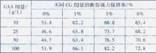 測試經(jīng)不同用量CAA及CG整理后織物的斷裂強力保留率,結(jié)果見表2。
