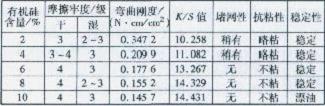 從表2可以看出,有機(jī)硅用量超過(guò)一定比例后,會(huì)使乳液不穩(wěn)定,產(chǎn)生漂油現(xiàn)象。有機(jī)硅含量增加,改善了織物手感,提高了干摩擦牢度和K/S值。因?yàn)榫酃柩跬闉橐着で穆菪沃辨溄Y(jié)構(gòu),可繞主鏈自由旋轉(zhuǎn),故主鏈?zhǔn)秩犴;另外,在焙烘時(shí),羥基硅油中的羥基可與纖維中的羧基相互作用,形成牢固的吸附和取向,從而降低纖維間的摩擦系數(shù),使手感非常柔軟、滑爽,且具有良好的抗粘性。綜合考慮,羥基硅油的用量在6%時(shí)效果最好。