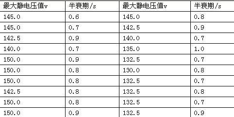表2中,平均最大靜電壓值為140.9V,平均半衰期為0.8s。