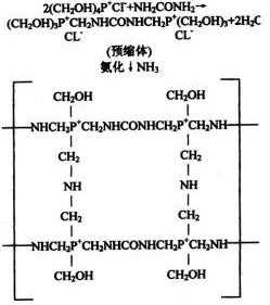 含磷化合物使纖維素纖維在熱介過程中產(chǎn)生脫水反應(yīng)。含磷阻燃劑在纖維熱解溫度范圍內(nèi)首先分解成不易揮發(fā)的磷酸或多磷酸酐與纖維素的羥基(—OH)發(fā)生脫水反應(yīng),使纖維炭化。浸軋過Proban阻燃劑的織物在氨熏過程中,由于在纖維素的內(nèi)部形成了二氯化磷/氮的高度交聯(lián)聚合物、產(chǎn)生P—N協(xié)同效應(yīng)。P—N鍵性能(極性)高于P—O鍵,使磷化合物與—OH反應(yīng)性能加強,所以產(chǎn)生了高效的耐久阻燃性能。具體反應(yīng)如下: