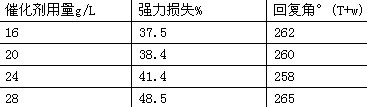 催化劑用量對(duì)樹脂交聯(lián)起著很重要的作用,MgCl2濃度過高形成所謂的"表面樹脂"對(duì)回復(fù)角的增加不起太大作用,強(qiáng)力損失反而增大,因此催化劑MgCl2用量控制在16-20 g/L左右。