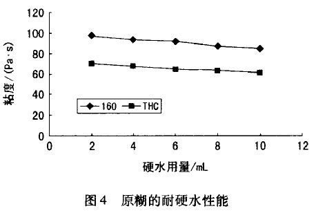 用CaCI:和MgCI:配成硬水溶液,在原糊中加入不同用量的硬水并測定粘度,結(jié)果見圖4。
