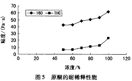 以1 g/100 g濃度的原糊為100% ,然后加水以不同比例稀釋,分別為100%、90%、80%、70%、60% 和50%,測定它們的粘度,結(jié)果見圖5。