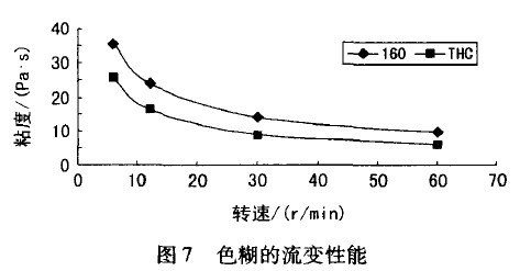 測定不同轉(zhuǎn)速下的色糊粘度,結(jié)果見圖7。由圖7可知,合成增稠劑Argoprint 160和Argoprint THC的流變性能相似,均屬于假塑性流體,其粘度隨剪切應(yīng)力的增加而急劇下降,這種流體特性使色漿具有良好的印制效果。