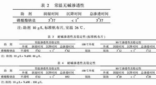 室溫將10g的助劑分別用60g/L、80g/L的堿液配成1000mL工作液,觀察外觀,參照檢測滲透性,然后升溫到100℃,升溫過程中觀察工作液的穩(wěn)定性,然后降溫到80℃,觀察外觀并檢測滲透性。