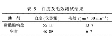 配方工藝及條件(浸漬法):助劑10g/L,NaOH60g/L,浴比1∶10,2~3℃升溫到98℃,保溫45min,洗3道熱水,洗冷水,脫水烘干,測試白度及毛效結(jié)果見表5。