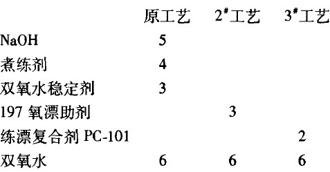 練漂復合劑PC-101、雙氧水、雙氧水穩(wěn)定劑、煮練劑、Bes活性染料、NaOH、Na2SO4、Na2CO3、197氧漂助劑。