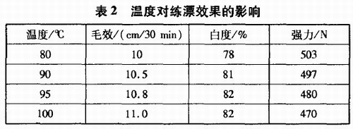 在不同溫度下,用3.1中的3# 工藝對牛奶蛋白纖維/棉織物進行練漂,結(jié)果見表2。