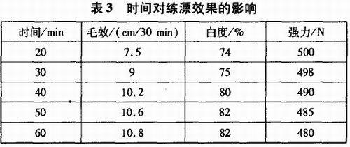 由表2知,隨練漂溫度升高,織物的白度和毛效逐漸增加,但織物的強力逐漸下降,尤其溫度達到100℃時,織物強力下降嚴重。為了保證織物的強力且獲得較高的白度,確定該織物的練漂溫度為95℃。
