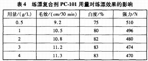 在95℃ 、40 min的處理條件下,練漂復合劑PC一101用量對練漂效果的影響見表4。