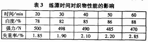 由表3知,在相同條件下,隨練漂時(shí)間的延長(zhǎng)?椢锏陌锥群褪е囟继岣撸珡(qiáng)力下降。根據(jù)染色要求,白度在85左右即可,因此,選擇練漂時(shí)間為40 min。