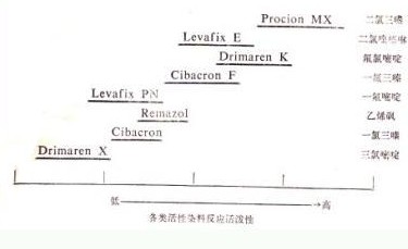 活潑染料的反應(yīng)性通常是指染料與纖維羥基反應(yīng)能力的強(qiáng)弱,反應(yīng)性強(qiáng)的染料在室溫、弱堿的條件下即完成固著,但這反應(yīng)性強(qiáng)的染料穩(wěn)定性相對(duì)較差,容易被水解失去染色能力。反應(yīng)性弱的染料需要在較高的溫度條件下與纖維素鍵合,或使用強(qiáng)堿劑活化纖維素的羥基,促使染料反應(yīng)固著在纖維上。