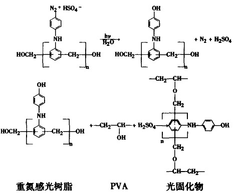 通常認(rèn)為,活性染料的印花色漿(特別是深色),其染料濃度高、堿性強(qiáng),又有大量的尿素和無機(jī)鹽,因此,要求感光膠層膜耐堿,就可避免砂眼的出現(xiàn),提高耐印率。然而,根據(jù)大量的理論和應(yīng)用研究表明:上述觀點(diǎn)不夠全面。我們認(rèn)為重氮感光膠制作的網(wǎng)版應(yīng)用于活性深色印花之所以發(fā)生上述問題,其最主要的原因在于,活性染料中的活性基團(tuán)含有的一氯均三嗪(X型和K型)、乙烯砜硫酸酯(KN)型和雙反應(yīng)性基團(tuán)(M型)等,當(dāng)這種反應(yīng)性基團(tuán)與絲網(wǎng)網(wǎng)版表面的重氮感光膠膜未經(jīng)光固化完全的PVA中的羥基發(fā)生化學(xué)反應(yīng),從而粘附于網(wǎng)版時(shí),經(jīng)刮刀或磁棒擠壓,即易產(chǎn)生印疵。其基本原理可用下述重氮光敏樹脂體系的化學(xué)反應(yīng)式表示: