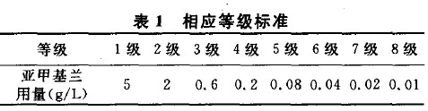 將試驗(yàn)所用織物浸于亞甲基蘭溶液中20 S后立刻觀察,所呈顏色即為相應(yīng)等級(jí)標(biāo)準(zhǔn)色(見(jiàn)表1)