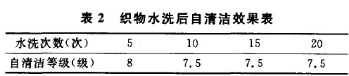 按照正常脫水一烘干的工藝流程,分別對(duì)整理樣進(jìn)行水洗5次,10次,15次,20次。水洗方法使用AATCC61- 1996的標(biāo)準(zhǔn)進(jìn)行。水洗后的整理樣在紫外光下照射16 h,自清潔效果如表2 所示。實(shí)驗(yàn)表明,水洗后的整理樣仍IH表現(xiàn)出較好的自清潔效果,因此,該工藝整理的織物具有較好的耐洗牢度。