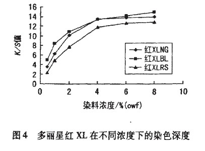 選用0.5%(owf)一8%(owf)多麗星大紅XLNG、紅XLBL和紅XLRS染料,在pH值為3.5的條件下染普通錦綸織物,結(jié)果見圖4。