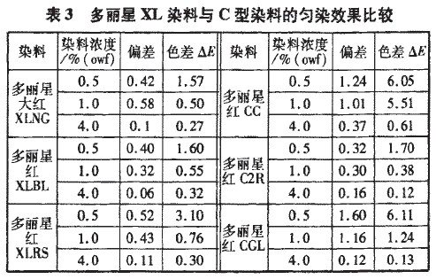 選用多麗星大紅XLNG、紅XLBL、紅XLRS染料,多麗星紅CC、多麗星紅C2R、多麗星紅CGL染料,在 pH值為3.5,不加勻染劑和其它助劑的情況下,對普通錦綸織物進(jìn)行染色,比較兩種不同結(jié)構(gòu)染料系列的勻染性能。選用0.5%,1.O%,4.0%三組濃度,以織物上三處不同點(diǎn)位的偏差和色花明顯區(qū)域的兩點(diǎn)色差來表示勻染效果,見表3。