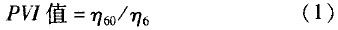 式(1)中, PVI 是印花黏度指數(shù), η60和η6 分別是轉(zhuǎn)速為60 r/min和6 r/min時的原糊黏度。