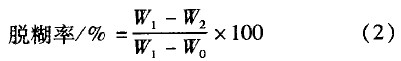 (2)脫糊率測試將織物烘至恒重,置于干燥器中冷卻,分別稱得印花前織物重w0,印花后未皂洗織物重w1,皂洗后織物重w2。按式(2)計算脫糊率: