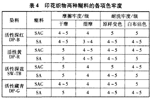 兩種糊料不同顏色印花織物的耐洗及耐摩擦牢度如表4。