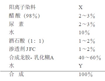 (1)染料:前面已經(jīng)論述選擇陽離子染料即可。適用于印花的國產(chǎn)陽離子染料如下.