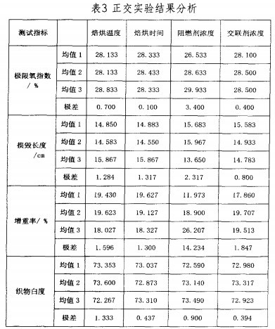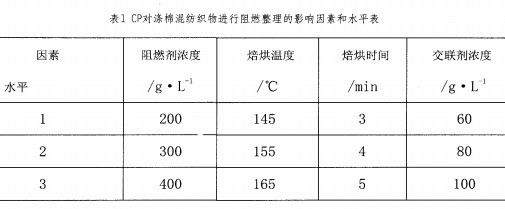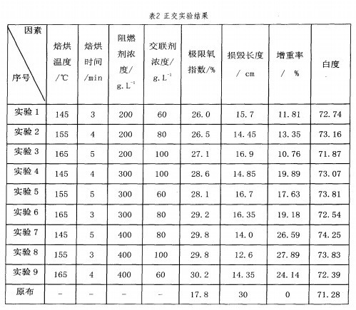 實驗首先以阻燃劑濃度、交聯(lián)劑濃度、焙烘時間、焙烘溫度為四個影響因素對阻燃滌綸/棉混紡織物進行正交實驗,而后進行單因素實驗。正交實驗中每個因素取三個水平,制訂的因素和水平表如表1所示。