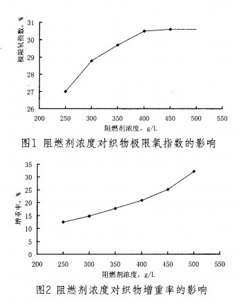 圖1顯示,整理后織物的限氧指數(shù)隨阻燃劑濃度的增加而變大,低濃度下,極限氧指數(shù)增幅較大;當阻燃劑濃度達到4OOg/L后,織物阻燃性能效果提升有限,且織物增重率顯著增長,使得織物手感發(fā)澀并提高成本,因此實驗中阻燃劑濃度取400g/L為宜。