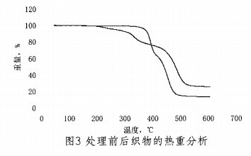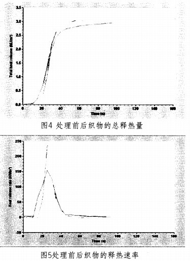 通過CP整理后的滌棉混紡織物的阻燃性能得到了顯著改善,實驗中采用熱重分析和錐量熱儀方法測定了優(yōu)化工藝處理前后織物燃燒過程的變化,結果如圖3一圖5所示。