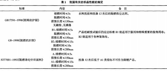 目前世界各國(guó)對(duì)具有阻燃性能服裝的要求都非常重視,這說(shuō)明服裝阻燃性在服裝功能性檢驗(yàn)中的重要性。我國(guó)有關(guān)紡織品性能的規(guī)定見(jiàn)表1。