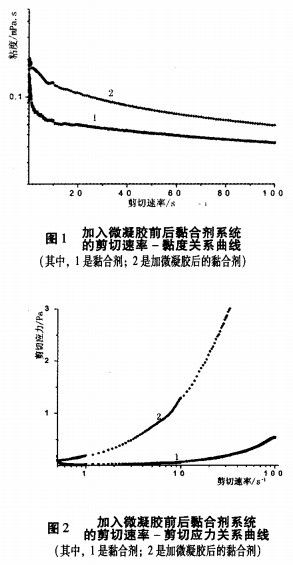 分別顯示了加入微凝膠前后黏合劑系統(tǒng)的剪切速率一黏度和剪切速率一剪切應(yīng)力關(guān)系曲線?梢钥闯鑫⒛z的使用導(dǎo)致更高程度的假塑性和觸變性。