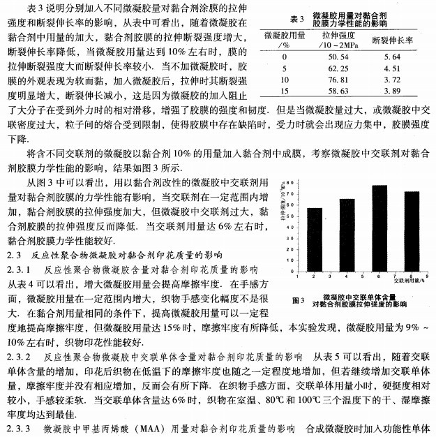 2。3。5塞網(wǎng)性(堵網(wǎng)性)測定或評定塞網(wǎng)性缺少標(biāo)準(zhǔn)方法,但在連續(xù)印花時容易暴露出來。本試驗(yàn)主要根據(jù)多次連續(xù)印花后篩網(wǎng)堵塞情況和印花洗網(wǎng)后繼續(xù)印花試樣的清晰度來比較。從印花過程及印花品的花紋上看出:用微凝膠改性后的黏合劑在印花時沒有出現(xiàn)塞網(wǎng)。