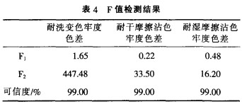 從表5可以看出。合成的固色劑的應(yīng)用性能達(dá)到了固色劑樣品水平。耐洗色牢度4~5級(jí)。耐干摩擦色牢度34級(jí)。耐濕摩擦色牢度3級(jí)。比未固色的織物色牢度都提高了0。5級(jí)。固色后色度差為4~5級(jí)。色光變化不大。