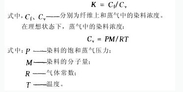 1、染料的轉(zhuǎn)移機(jī)理 氣象轉(zhuǎn)移印花,基于聚酯纖維及其他合成纖維在高溫下能吸收分散染料蒸汽。在高溫平衡狀態(tài),染料在聚酯纖維及其周圍飽和蒸汽中分配,單位體積纖維上的染料分子,是其周圍對(duì)應(yīng)蒸汽體積聚合物中染料分子的10倍。其分配系數(shù)為: