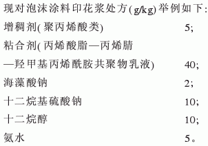 涂料泡沫印花漿的制備方法是將含有增粘劑、粘合劑與表面活性劑等的水溶液組成物,在不溶性惰性氣體存在下攪拌變稠,使其產(chǎn)生泡沫,泡沫體積為原水溶液體積的1.5~3倍。任何水溶性增稠劑均可使用,但最合適的是聚丙烯酸類(lèi)增稠劑;最適宜的粘合劑為丙烯酸脂與丙烯腈的半交聯(lián)乳化液聚合物。表面活性劑(發(fā)泡劑)最好用十二烷基硫酸鈉,為了幫助印花漿水溶液產(chǎn)生泡沫,最好要按溶液重量加入0.05%~0.5%的海藻酸鈉,它能夠改進(jìn)泡沫的結(jié)構(gòu),另外按水溶液重量的0.5%~50%加入十二烷醇,目前尚在研究采用易蒸發(fā)掉的發(fā)泡劑和穩(wěn)定劑的課題,深受印花業(yè)的關(guān)注。